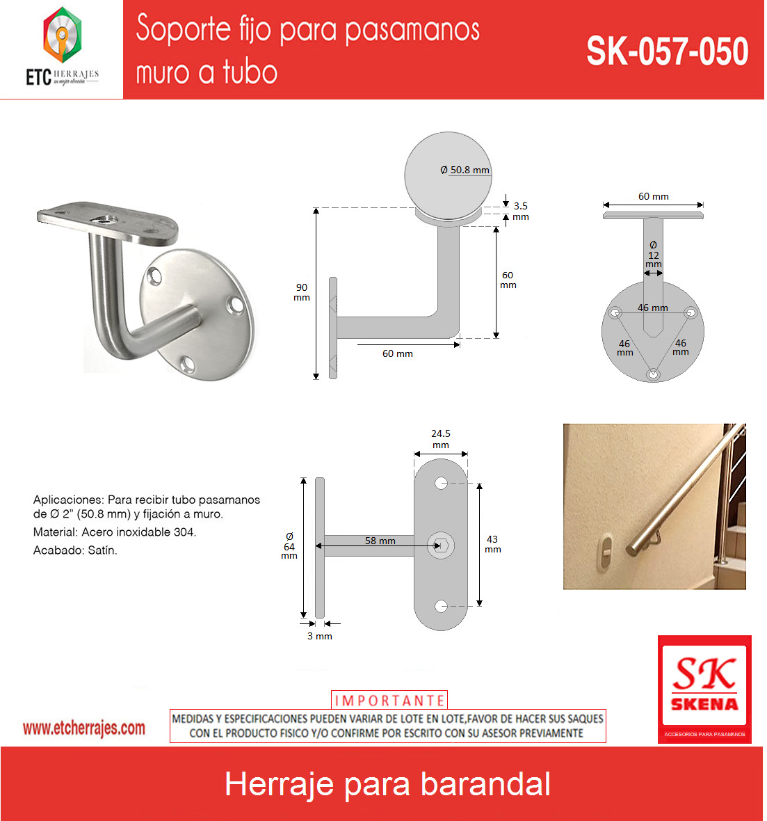 Soporte fijo para pasamanos muro a tubo SK-057-050