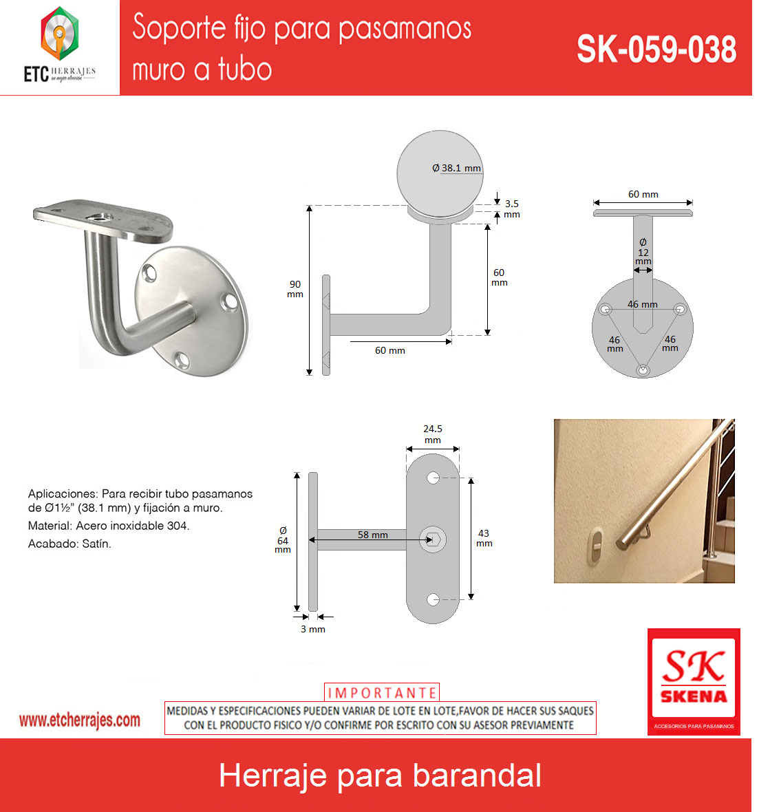 Soporte fijo para pasamanos muro a tubo SK-059-038