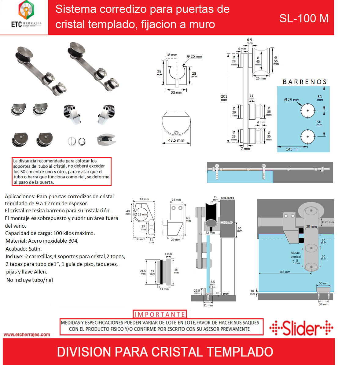 Sistema corredizo para puertas de cristal templado, fijación a muro SL-100 M